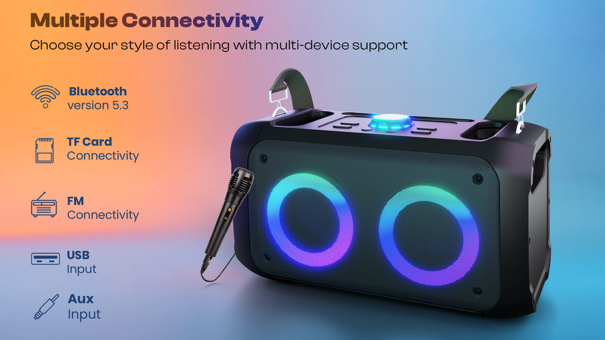 Experience powerful audio with the iNFiRe Boombox, a dynamic 24W party speaker that delivers crystal-clear sound with enhanced bass. This versatile speaker features advanced Bluetooth 5.3 technology for swift pairing and stable connectivity up to 10 meters. The sleek black unit, crafted from durable ABS material, measures 16.2 x 8.1 x 8.1 centimeters and weighs just 315 grams, making it perfectly portable. Multiple input options include a USB drive, TF card slot, AUX input, and FM radio, accommodating various audio sources. The included wired microphone transforms it into an ideal companion for karaoke sessions and announcements. Convenient touch controls allow easy management of playback functions. The built-in 2400 mAh rechargeable battery provides up to 8 hours of continuous entertainment. Featuring vibrant RGB lights, this 2.0-channel speaker system adds a festive atmosphere to any gathering. Whether for indoor parties, casual listening, or small events, this speaker combines functionality with entertainment value. The package includes a power cable for easy charging, and the product comes with a one-year brand warranty.
