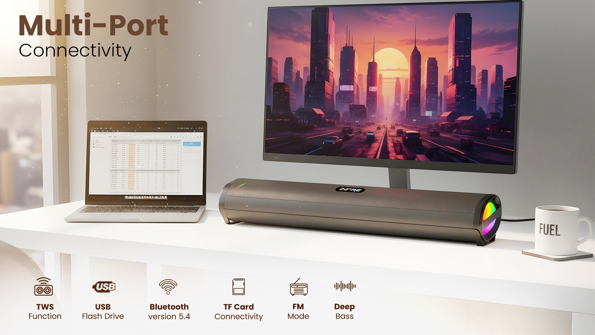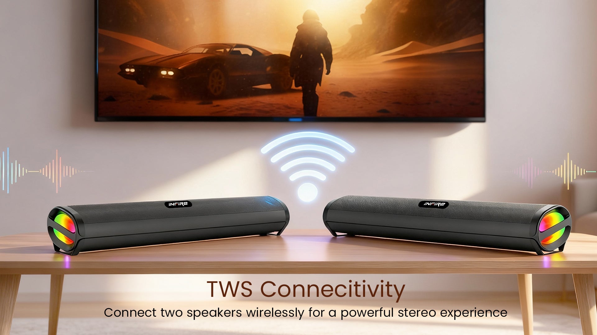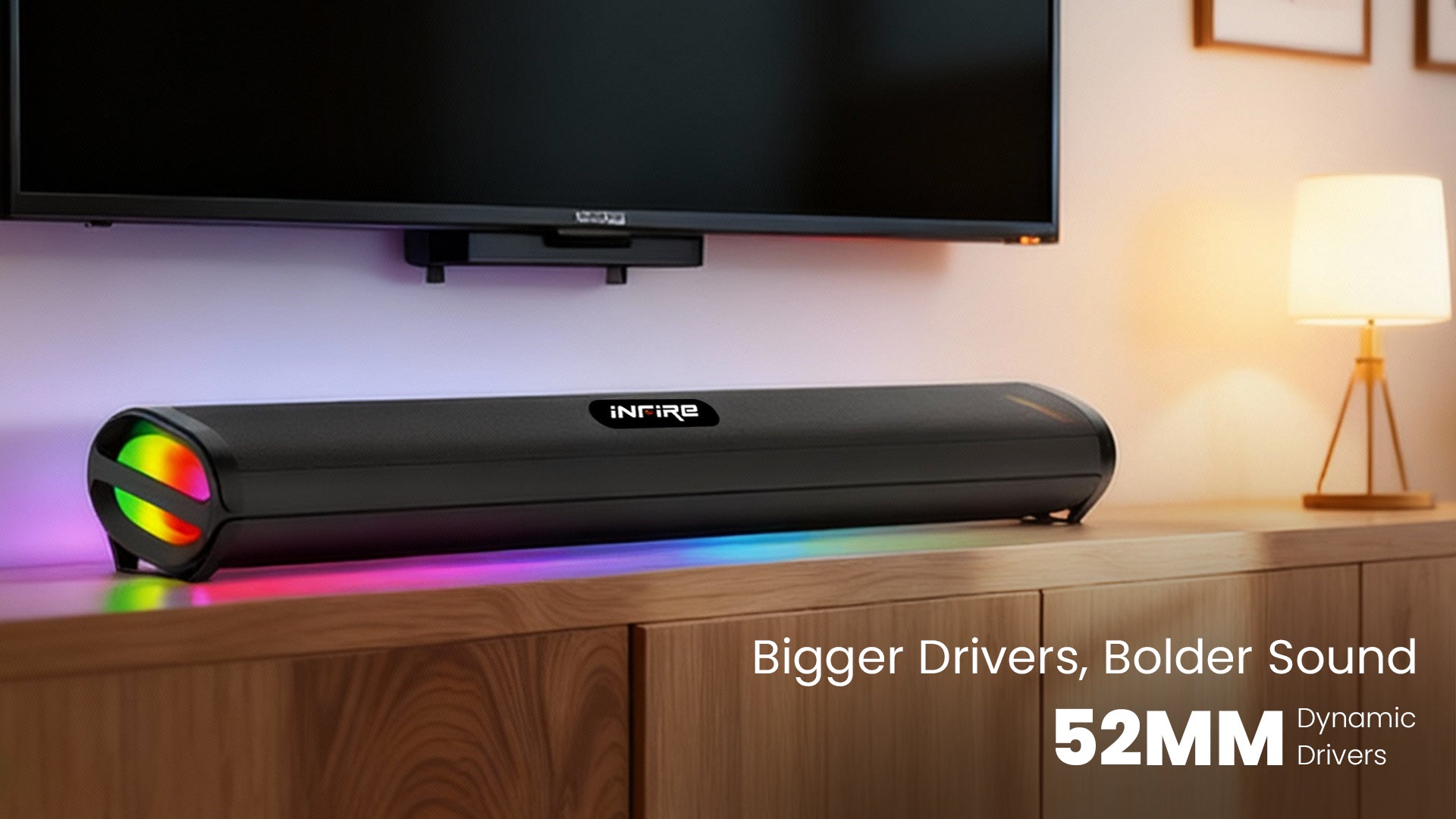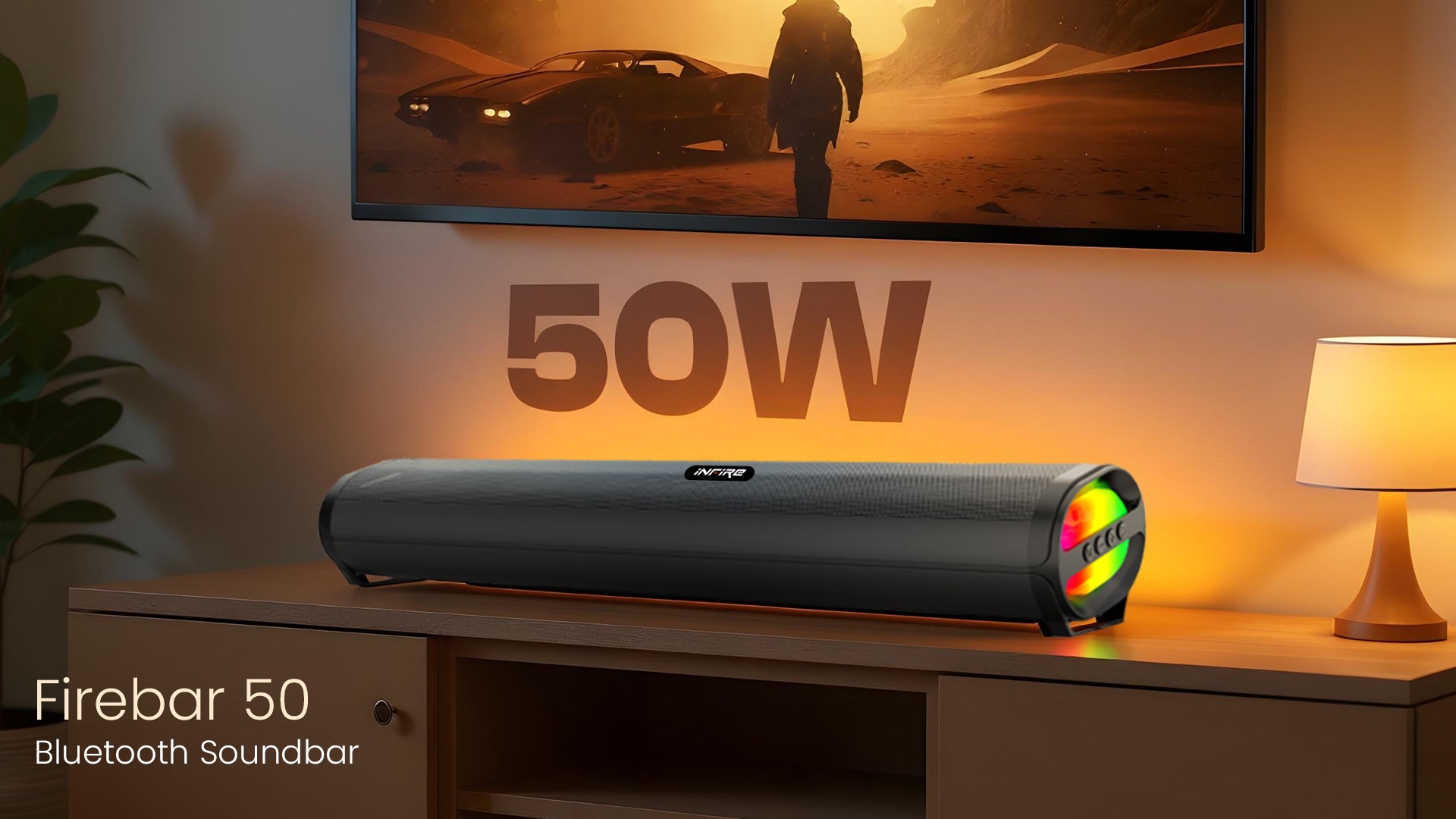 Experience immersive audio with the iNFiRe FireBar 50, a 50W Bluetooth soundbar designed for superior sound quality. Equipped with Bluetooth 5.4 for stable wireless connectivity, it delivers deep bass that enhances your music and movies. The soundbar features vibrant RGB lights to create an engaging atmosphere. Multiple input options, including AUX, USB, TF card, and FM radio, provide versatile playback choices, making it a comprehensive audio solution for any setup.