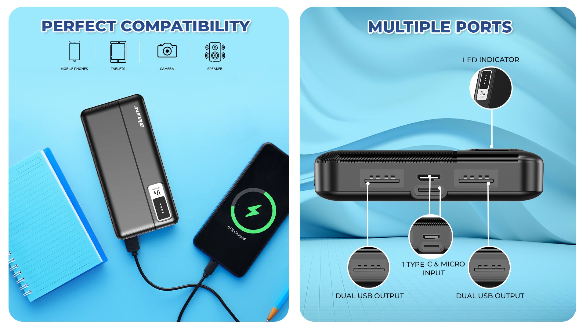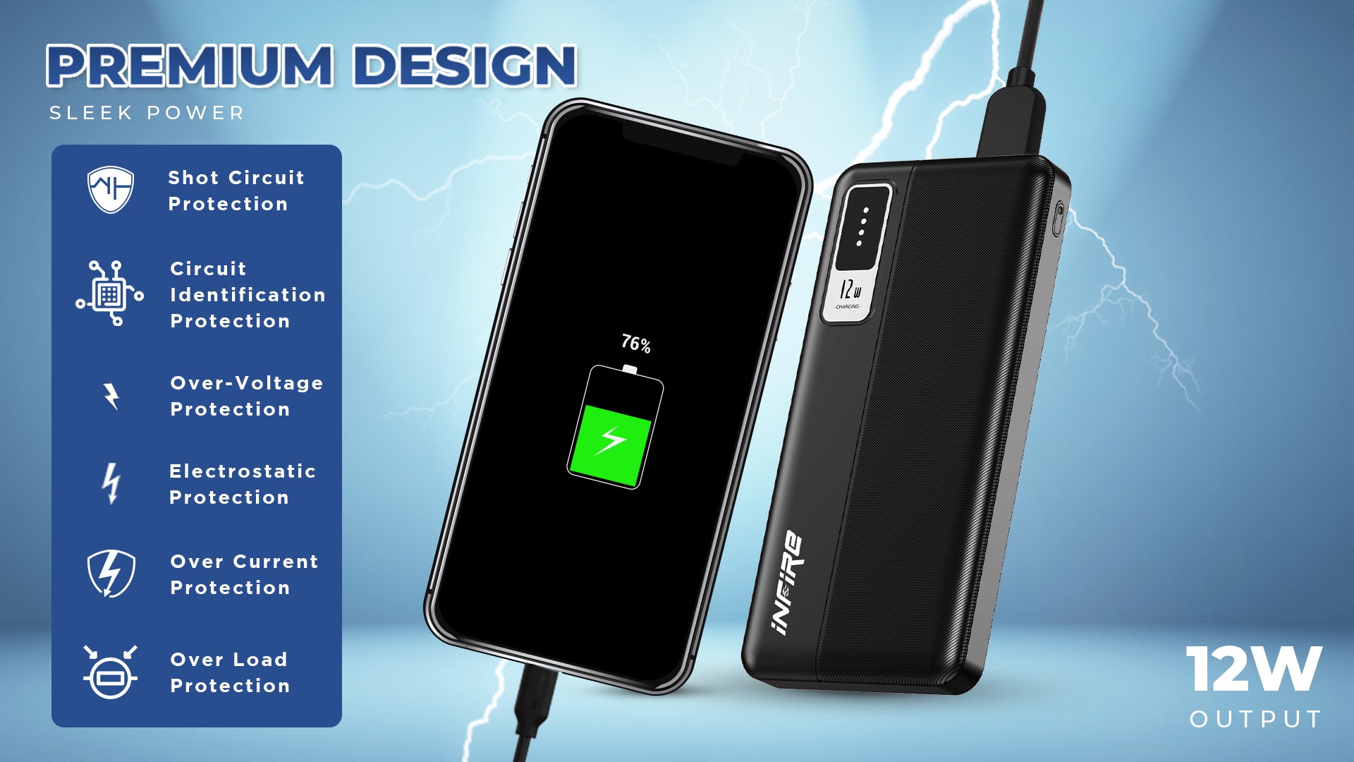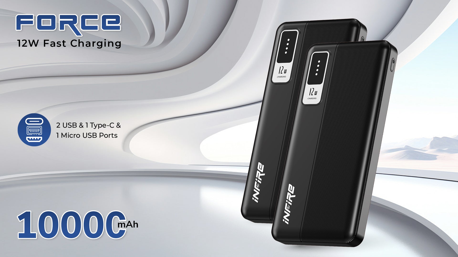 Stay connected on the go with the iNFiRe Force 10000mAh Power Bank. It features 12W fast charging and dual USB output for efficient charging of your devices. With one micro USB input, one type C input, and LED indicator, this power bank is lightweight and user-friendly. Keep your devices powered up anytime, anywhere.
