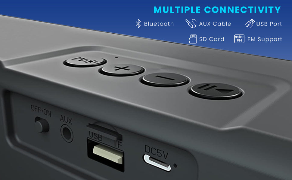 - Multiple Connectivity FireBar 20 Stream all your music wirelessly with its multiple connectivity(BT, AUX, USB, FM,SD Card Slot).